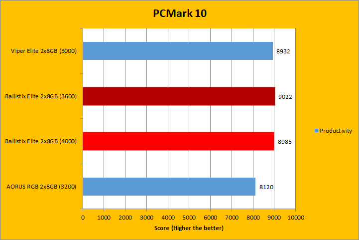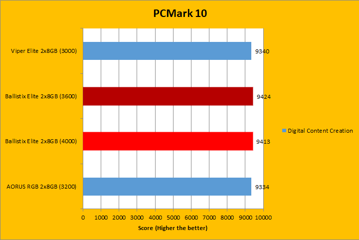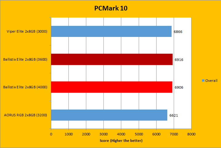 PCMark 10 is the latest version of the popular full system benchmark from UL. A standard benchmark run provides scores in three categories, which includes Essentials, Productivity, and Digital Content Creation. Wrapping up all three categories is an overall score in the end. After the synthetic tests, we can see the PCMark 10 results show the Ballistix Elite kit has the slight edge in all of the categories. Its higher operating frequency may seemingly make a difference, though there is clearly more than just memory frequency at play, as the DDR4-3000 kit provided better scores than the DDR4-3200 one. This could also display how the Zen architecture benefits from various memory speeds and latency.