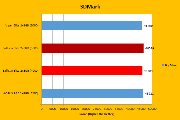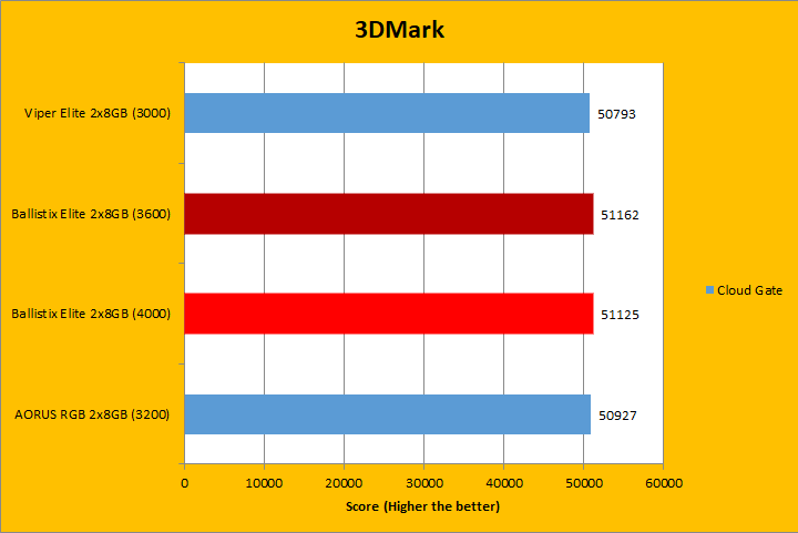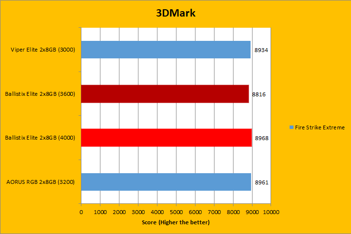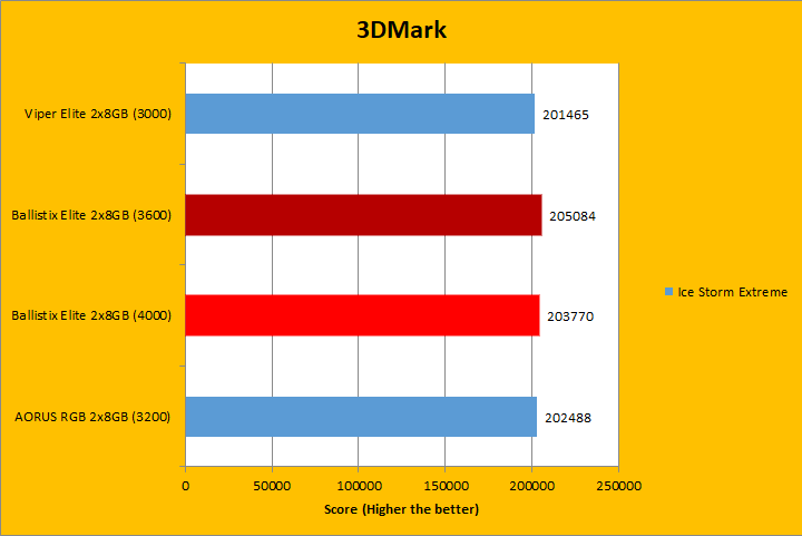 Similar to UL's PCMark 10, 3DMark is a favorite among enthusiasts and reviewers. It has been a part of the APH Networks' battery of standard benchmarks since our start. The latest iteration of 3DMark is available in several presets, so we included Fire Strike Extreme, Sky Diver, Cloud Gate, and Ice Storm Extreme; each in decreasing of GPU dependency for our RAM tests. To give our test platform a little more comprehensive results, I enabled the Extreme option in our tests where possible. As you can see in the graphs above, the three tested RAM remained pretty close, with the largest difference only in the Ice Storm Extreme. The Ballistix Elite DDR4-4000 2x8GB was ahead of the pack in majority of the tests, with the exception of Sky Diver. Memory frequency played a role in these tests, albeit not necessarily a huge one.