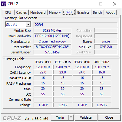 A screenshot of the memory tab in CPU-Z with Micron's Ballistix Tactical Tracer RGB PC4-24000 4x8GB installed. The SPD timings table in CPU-Z reads standard JEDEC specifications programmed into the memory as well as Intel XMP data for running the memory at various speeds. Using the latest BIOS revision, our Gigabyte GA-Z170X-UD5 motherboard used for testing had no issues detecting and working with the Crucial RAM right out of the box. The Ballistix Tactical Tracer RGB PC4-24000 4x8GB retails for approximately $360 at press time.