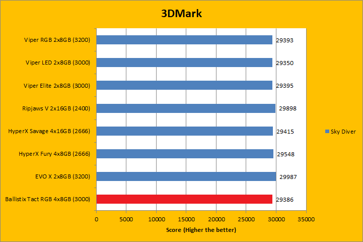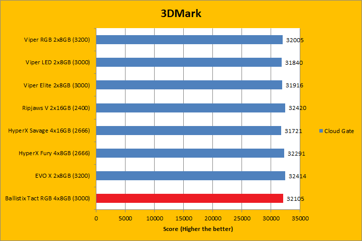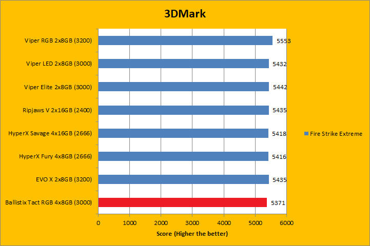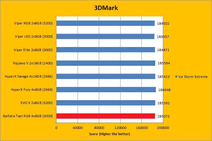 Like UL's PCMark 8 benchmarking suite, 3DMark is yet another favorite among enthusiasts and reviewers alike. In fact, it has been part of the APH Networks' battery of standard benchmarks since the very beginning. The latest iteration of 3DMark is available in a series of presets. We included Fire Strike Extreme, Sky Diver, Cloud Gate, and Ice Storm Extreme; each in decreasing order of GPU dependency for our RAM tests. To give our test platform a little more comprehensive results, I enabled the Extreme option in our tests, where possible. As you can see in our graphs above, the DDR4-3000 Ballistix Tactical Tracer RGB PC4-24000 4x8GB remained generally consistent with the pack. Bandwidth played a small role here.