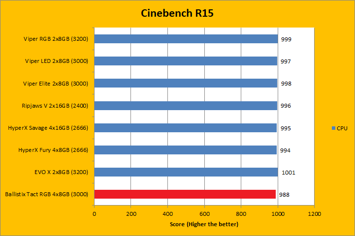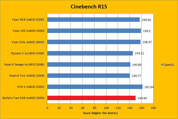 Cinebench R15 is separated into two tests: One tests the CPU image rendering performance, while the other benchmarks the OpenGL video rendering performance. Obviously, having a fast processor and a powerful video card, respectively, will play a much more significant role in determining these scores, but that does not mean RAM does not do anything at all to contribute to these results. As you can see in our charts above, the Ballistix Tactical Tracer RGB PC4-24000 4x8GB did acceptably in both tests; but was often outperformed by other memory modules of the same bandwidth specification. If you have a Core i5, you will not see such a big variance in the results in relation to memory bandwidth. A Core i7, however, can take advantage of faster memory, as it did in this case.