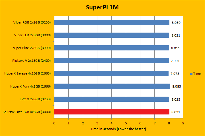 We have always included SuperPi in our benchmark results, because it is a quick and dirty run that always proves to be interesting. It is neither the fastest way to calculate Pi nor is it the most challenging. But being an enthusiast at heart, this program has always provided interesting results for showing off your overclocking prowess on your favorite online forum. This time around, the Ballistix Tactical Tracer RGB PC4-24000 4x8GB scored mid pack, albeit being the second fastest rated memory kit in this test. That said, wherever you were in the rankings, the differences were negligible at best.