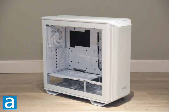 The Dark Base 701 supposedly maximizes air flow, and this is quite apparent with the number of openings in this case. The front panel of the case is a giant flat metal mesh grille, which is angled on each side and feels solid. The mesh allows for front air intake. Two large vertical translucent pieces of plastic flank the mesh on each side, diffusing the addressable RGB LED light strips. Near the bottom of the mesh is a small be quiet! logo embossed in silver on a white background.