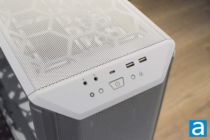 At the very top angled lip are the front user-facing I/O ports. From left to right, we have a 3.5mm microphone jack, 3.5mm headphone jack, USB 3.2 Gen 2 Type-C port, and two USB 3.2 Type-A ports. Below the ports, from left to right, we find the fan control button, the power button in a downward trapezoidal shape, and the RGB LED control button. This bottom row of buttons is encircled by elegant illumination of white LEDs under the panel. Furthermore, the light around the fan control button increases in brightness depending on the setting of the fan speed intensity. Otherwise, the fan and RGB LED controls cycle through three different levels of their respective control, and are connected to the internal controller hub.