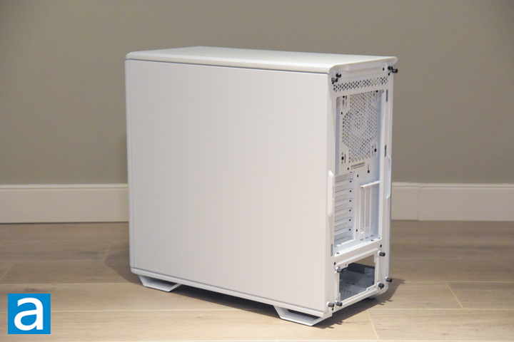 On the left side, we have the 4mm tempered glass panel that allows for a full view of the internal components. It is affixed to a white metal border that secures it to the side of the case. It also doubles as a place to hold it with grubby grasping appendages to avoid fingerprints on the glass. The glass edges are chamfered and are smooth to the touch.