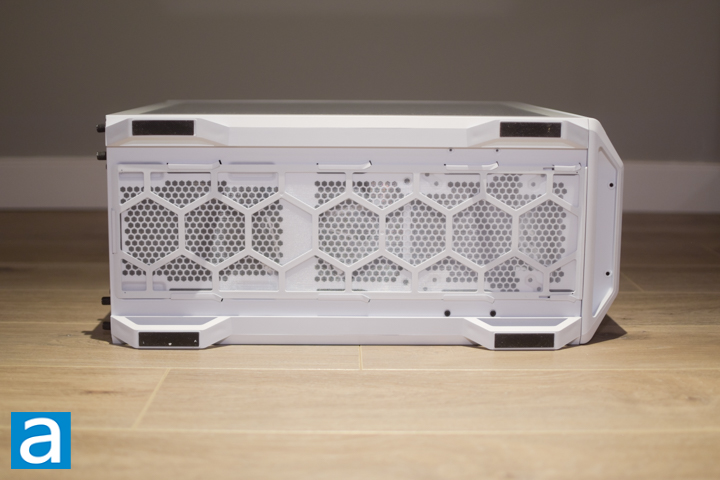 On the bottom, we find four plastic trapezoidal feet that support the case. Each foot has a rubber pad to stop the case from sliding around and provides some vibration and sound dampening. The four case feet provide 28mm of elevation from the ground. The plastic feet are molded onto lengthwise plastic rails that are secured by several sliding hooks and a screw on the inside of the case. Once again, the plastic edges on the feet are on the sharper side. There are also four screw holes near the front to mount the optional HDD bracket that fits a separately purchased HDD cage. Finally, there is a removable fine mesh filter with a plastic hexagonal lattice frame. This cannot be removed without first removing the front panel though. Behind, there are hexagonal-patterned openings for air intake to the power supply and optional front-bottom air intake.