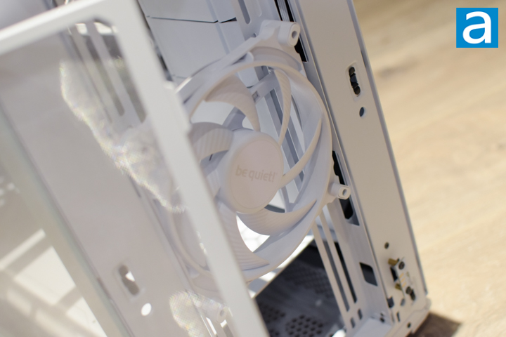 On the be quiet! Dark Base 701, the front, sides and top panel can be easily taken off. The front panel can be removed by yanking on the handle at the bottom. It is held in by six flat ball-and-socket joints. Unfortunately, one of the sockets broke upon removal, but the panel is still fairly secure. An interesting feature found here is a small electrical panel with pogo pins to send power and information to the addressable RGB LED strips contained in the front panel. With the front panel removed, the front and bottom filters can be accessed and removed for cleaning. The front mesh is magnetically held on at the top and swings out, while the bottom mesh filter slides out from the front. Behind the front mesh, is a fan and radiator bracket that is held in with two captive thumbscrews. This bracket can be completely removed for easier installation of components. It has space for three 140mm fans, three 120mm fans or up to a 360mm radiator. In stock configuration, a be quiet! Silent Wings 4 140mm PWM high-speed fan is installed in the middle position.