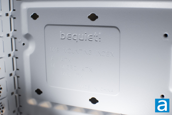 Moving to the motherboard mounting area, this case can accommodate up to a 30.5 x 27.5cm E-ATX board. There is a clear debossed mounting index indicating with letters to indicate which standoff holes are for the different motherboard types. You can see the case is made in China based on these markings. Nine standoffs are preinstalled for an ATX motherboard. Perhaps due to the invertible internal layout, there is a good amount of flex for the mounting area. For motherboard cooling, a 185mm tall air cooler can be installed. On the back, there is a preinstalled 140mm Silent Wings 4 fan as well. Optionally, a 120mm radiator can fit here instead.