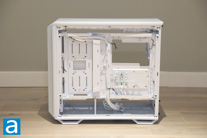Beside the fan controller, a 2.5” drive can be mounted. There is also room for either two 3.5” or 2.5” storage options to be installed on the left side. A total of three 2.5” and two 3.5” drives can be mounted in the case with the included hardware. Plenty of cable management troughs and tie down spots are found throughout the back. There is 24mm between the panel and the tray for cable management. The central large cable channel is well-designed to easily accommodate the 24-pin ATX cable and still has room for practically any other cable that needs to be there. Additional details like the two rubber pads on this channel to prevent rattling on the side panel are a nice touch. There is plenty of versatility and “maximum usability” for cable routing and drive mounting in this area.