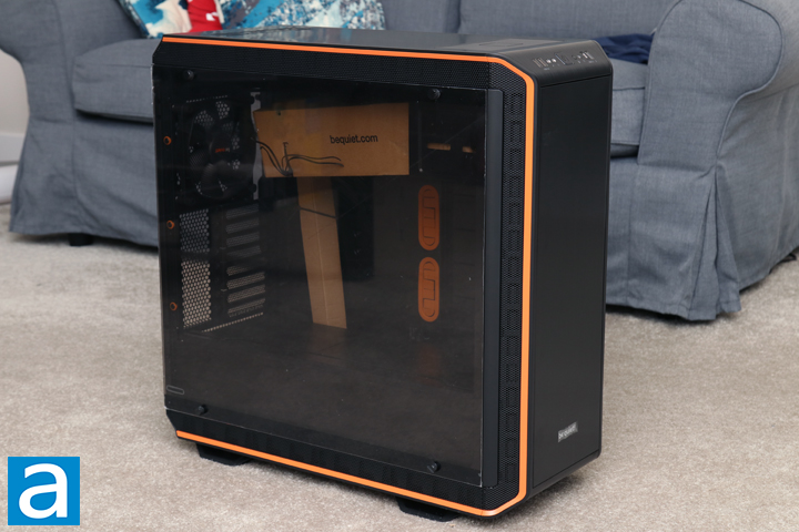 After taking off the fabric bag and plastic wrap on the be quiet! Dark Base Pro 900 rev. 2, I had to take a step back to really understand how large this case was. In some ways, the size is an unavoidable topic, almost like the elephant in the room. There are a few design elements that try to make it seem a bit smaller than it actually is, including curved edges and sloping sides. All of the corners of this case are curved or cut down too. Even so, this case is unapologetically big and just comes with the territory of this form factor. In terms of colors, this is the Orange variant so you will see several orange highlights around the case, including the ring around the left side. Otherwise, the rest of the chassis is black in color. Around the edges we have a mesh pattern on both sides, which is to help with airflow in this tower. The front panel is a solid panel made up of aluminum with a brushed metal finish. This panel has a be quiet! logo on it, and swings open on one side to give users access to other things inside, as we will see later on. Appearance wise, it is not exactly a gamer case, but it stands out in terms of its size and design.