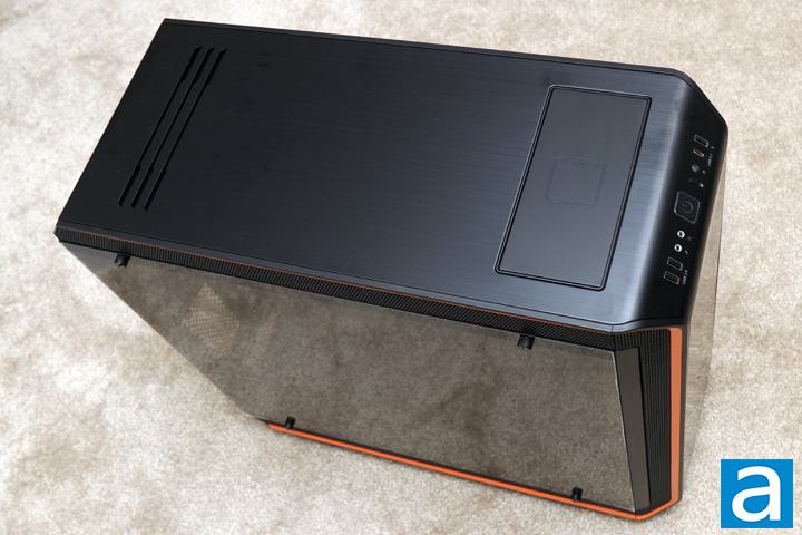 At the top, there are a few interesting things to speak of. At the front, you can see all of the I/O on the be quiet! Dark Base Pro 900 rev. 2. This includes two USB 3.1 Type-A ports, pair of headphone and microphone audio jacks, square power button with an orange LED underneath for power status, LED controller switch to toggle the internal RGB controller, round white hard drive activity light, USB Type-C port, and one more USB port. This last USB port is not connected to the computer, but instead provides 5V at 1A for charging devices. While more modern USB chargers now offer more wattage for charging, it is nice to see this option without taking away from any USB ports. The first revision of the Dark Base Pro 900 actually had two USB 2.0 ports here instead of the Type-C and charging ports. In addition, if you want to charge without connecting cables, you can use the integrated Qi wireless charger located on the top panel of the Dark Base Pro 900 rev. 2. This is useful for mobile devices and wireless peripherals that support this wireless charging standard, like the Cooler Master MM831. Otherwise, the rest of the top panel is flat with only two small slits at the back of the case for exhausting air out. While some cases may have better ventilated tops for their cases, this is still a be quiet! case, so noise dampening is the bigger priority here.