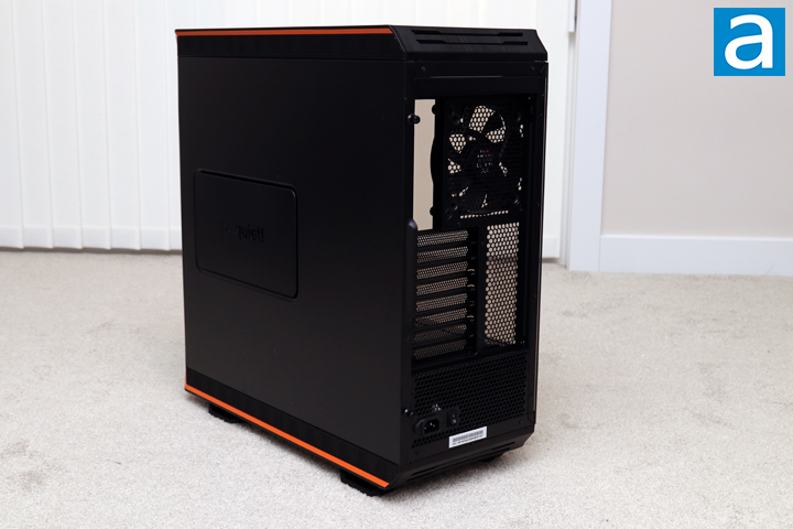 Moving to the right side and the back of the case, you can see we have a mostly standard look, though there is one difference. At the back we have a large opening at the top for the motherboard I/O panel. Beside this is an opening with mounting positions for either a 140mm or 120mm fan, though a 140mm fan is already attached on the inside. Underneath, we have eight slots for expansion cards. This is standard for a full-tower chassis. Interestingly enough, we actually do not have any vertical slots for vertical placement of the graphics card, which means you will not be able to do so in this case. Finally, at the bottom, we have a mesh area and a single power socket, but no opening for the power supply. This is different from most cases, as usually the power supply would be exposed at the back of a full-tower. However, all will be explained when we dive inside the Dark Base Pro 900 rev. 2. Otherwise, the right-side panel here is held on with two captive thumbscrews and slides off easily. It has a plastic insert with an opening underneath. This insert can be propped open or popped off completely to allow for more ventilation.