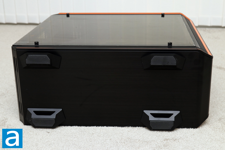 Continuing on the topic of size, the whole case is classified as a full-tower with motherboard support of up to E-ATX motherboards. In terms of dimensions, the chassis is 577mm in length, 243mm in width, and 586mm in height. Comparatively speaking, the only other full-tower case I reviewed was actually the first case I reviewed, the Cooler Master Storm Stryker. That case was larger in all dimensions, but was actually a kilogram lighter. At a weight of 14.39kg, this Dark Base Pro 900 rev. 2 is almost double the weight of some mid-tower cases. Looking at the materials, the weight is understandable when you see the mixture of aluminum, ABS plastic, and a 4mm thick tempered glass side panel. These material choices do make the case both sturdy and heavy.