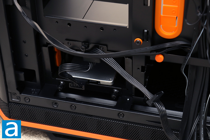 While it would have been tempting to start with installing the power supply, I decided to first start by installing my 2.5" drives. As I have mentioned what a storage king this be quiet! Dark Base Pro 900 rev. 2 is, you can also tell that finding a spot for my two SSDs is not a problem. Using the basement cage, I have installed the Patriot P200 512GB and OCZ ARC 100 240GB here. Interestingly enough, this cage requires you to install a drive upside-down, but this actually helps with plugging in the power and SATA cables here. The mounts are positioned in a way that the connections are easily exposed for the cables to be plugged in. As I only have two drives here, I did not end up using any of the additional included cages for my drives.