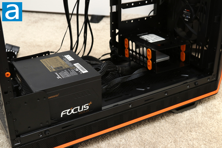 Unfortunately, this is where the slightly more challenging part of the build comes to reality. In order to install a power supply, I needed to remove the motherboard tray, power supply shroud, and the power supply bracket. From this point, this is exactly how the first revision of the Dark Base Pro 900 rev. 2 is, as it did not come with the shroud. Getting to this point was a bit challenging, as I also removed the motherboard tray to get better access. In retrospect, I probably did not have to do as such, but it did allow me to explore the modularity of this case. After installing the power supply, which is the Seasonic FOCUS Plus 850 Gold 850W, I plugged in all of my cables and switched this power supply on. This PSU is pretty compact at 150mm in length, and be quiet! says that users can install power supplies up to 284mm in length. There is technically a fan intake bracket at the bottom if you want to employ a fan here, but doing so will limit the power supply length quite a bit. Otherwise, there was ample amounts of space for excess cables in this basement even with the drive cage at the front. Overall, while I do like the power supply shroud, it was a bit of work to remove.