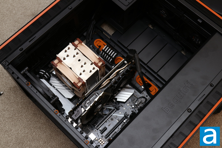 With the power supply in place, I mounted my ASUS Prime X470-PRO motherboard with an AMD Ryzen 7 3700X installed. On top of the processor, I mounted the Noctua NH-U12A. At a height of 158mm, this cooler is well under the maximum 185cm height specified by the manufacturer. Of course, if you choose the liquid cooling route, you have many installation options for the radiator at the top and the front. I also put my MSI GeForce GTX 1070 Ti Titanium, which measures at a length of 279mm. In the be quiet! Dark Base Pro 900 rev. 2, you can use graphics cards as long as 472mm, or 323mm with a drive bracket installed. This amount of clearance will not be an issue for even the newer and longer Ampere graphics cards, but it may mean changing where you mount the additional cages. Even so, I would not be worried.