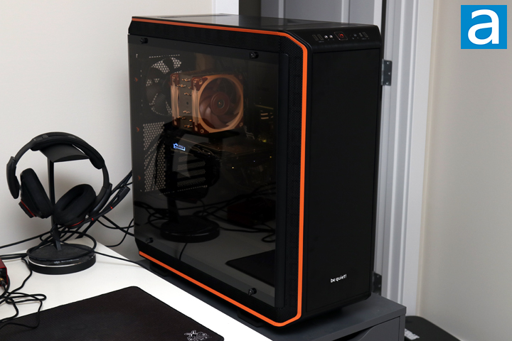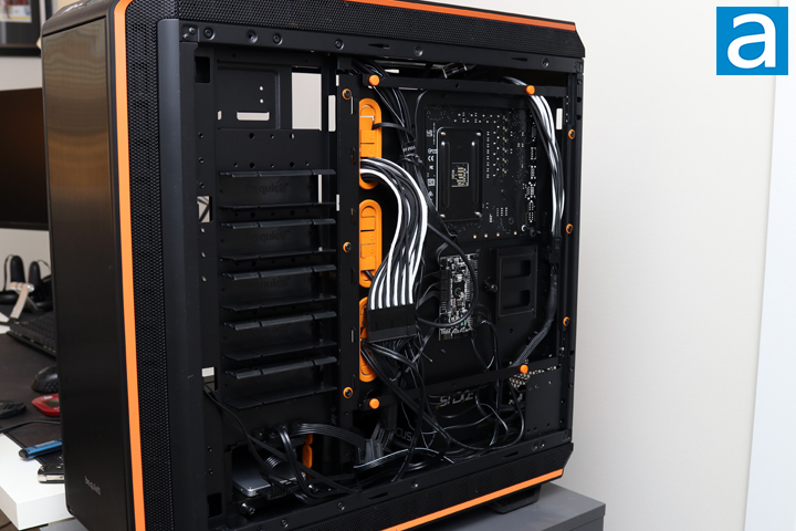 I hit the power switch on the back, clicked the square power button, and the orange illumination glowed as the computer came to life. It was a bit of a chore to build in this case, but the finished product is definitely worth admiring. I probably would have liked a better way to hide excess cables at the bottom of the motherboard, but it is not a huge deal. With the three large fans included with the be quiet! Dark Base Pro 900 rev. 2, it is no surprise the fans do spin up and make a bit of noise. According to the standard APH Networks sound scale, where 0 is silence and 10 is loud, the be quiet! Dark Base Pro 900 rev. 2 is around a 4.5/10 when operating at full speed. On the other hand, under regular operation, this reduces down to more of a 2.0/10. With all of the insulating material and rubber dampeners, these fans do still emit an audible noise, but in day-to-day operation, this should not be an issue. Otherwise, I really like the LED strips included here. You can either control the light to cycle between different colors and breathing effects with the physical button or synchronize it with your motherboard software.