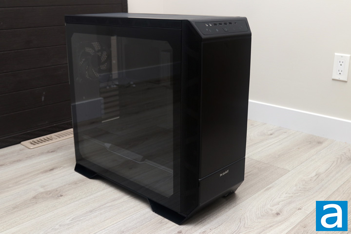 At the front, there is a solid panel with metal grilles down both sides. You can swap this out for a mesh panel instead, as you will see later in the review. At the bottom, we have a shiny be quiet! logo over another solid portion. This area is divided from the top with the first addressable RGB LED light strip. Interestingly, this area can be opened up from the front and it reveals a large slot. This is where you can install a 5.25" optical drive in your system, which is a blast from the past. While I have not seen accommodations for this in quite a while, it is understandable why some users will want this still, especially in an enclosure this large. Around to the side, we have a tempered glass panel to give users sight lines into your system.