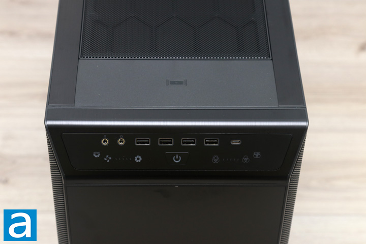 All of the front I/O on the be quiet! Dark Base Pro 901 are on the slanted top edge. The top row has two 3.5mm audio jacks for microphone and headphone, respectively, four USB 3.1 Type-A ports, and one USB 3.2 Gen 2 Type-C port. This means you will need two USB 3.0 headers if you want all of the USB Type-A connections to operate. Underneath, we have three primary sections. On the left, there are touch sensitive buttons to control the fans. Inside, there is a fan controller to either control all the fans or synchronize them to a single header on the motherboard. The button marked with "Sync" enables or disables the motherboard control, while the two buttons beside are used to decrease or increase the fan speeds. There are five bars in between the buttons to show its current operation speed. In the middle of the second row, we have a trapezoid power button. Finally, the right side controls the addressable RGB LED lighting. Once again, you can synchronize this with your motherboard if you have a standard 5V addressable header. The buttons here cycle through different effects and colors of the lighting. Otherwise, all of the plugs and buttons are either translucent or marked with a border in the same color. This is because a white LED illuminates all of these areas, which adds a very premium look.