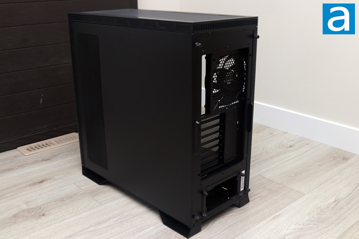 On the flip side, you can see a solid steel panel with another mesh area. This allows for airflow as users can mount fans facing this direction. Otherwise, the backside has a few interesting areas. At the top, we have the motherboard I/O cutout with an exhaust area next to it. It has mounting holes for 140mm and 120mm fans, although a single 140mm fan occupies this area. Underneath, we have eight expansion slots secured with screws. The slots have perforations for air to pass through. As well, the expansion slots are mounted on a rotatable square so users can turn it 90-degrees for vertical mounting of graphics cards. Moving on, we have a power supply opening at the bottom of the case, with a bracket around it to mount an ATX PSU. This bracket is held on by captive thumbscrews, just like the two side panels. The bracket is also lined with a foam border to reduce any vibrations and resulting noises between the power supply and the case.