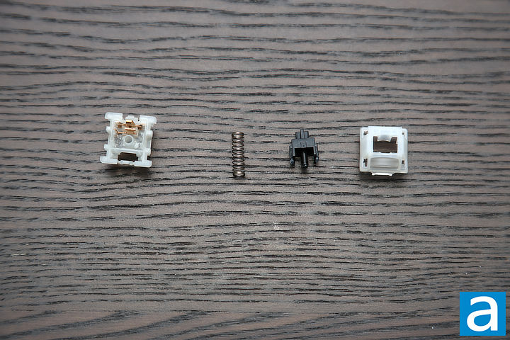 With the keycaps removed, the switches became more visible. The Dark Mount Silent Tactile uses be quiet! Silent Tactile Black switches, which I personally found to feel most like brown switches. The Silent Tactile Black switches are Cherry MX, 5-pin hot-swappable, and PCB mounted, making key replacement or maintenance simple. Each switch has a POM (polyoxymethylene) stem, a PA66 (Nylon 66) housing, and a spring that measures 1.3 cm. As advertised, each switch was pre-lubed. No extra switches are included in the box.