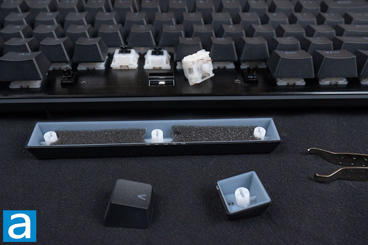 I started the disassembly of the be quiet! Dark Mount Silent Tactile with the main keyboard, leaving the number pad untouched. Removing the keycaps were straightforward, and I immediately noticed how thick they felt. The translucent inner layer under each key is responsible for the RGB LED light diffusion and translucent legends. As mentioned prior, the keys are double-shot PBT, or polybutylene terephthalate, keycaps, which allow the keys to be highly resistant to wear and tear. The PBT keycaps also produce a deeper, muted sound compared to their ABS, or acrylonitrile butadiene styrene, counterparts, due to the thicker walls and higher density. The keycaps support standard Cherry MX stems and have an OEM profile. The larger keys feature plate-mounted stabilizers, which are pre-lubed and surprisingly solid. There was no stabilizer rattling at all during testing.