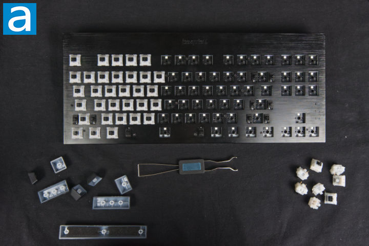 With the keycaps removed, the switches became more visible. The Dark Mount Silent Tactile uses be quiet! Silent Tactile Black switches, which I personally found to feel most like brown switches. The Silent Tactile Black switches are MX-compatible, hot-swappable, and PCB mounted, making key replacement and maintenance simple. Each switch has a POM, or polyoxyethylene, stem, a PA66, or Nylon 66, housing, and a spring that measures 1.3 cm. As advertised, each switch was pre-lubed. No extra switches are included in the box.