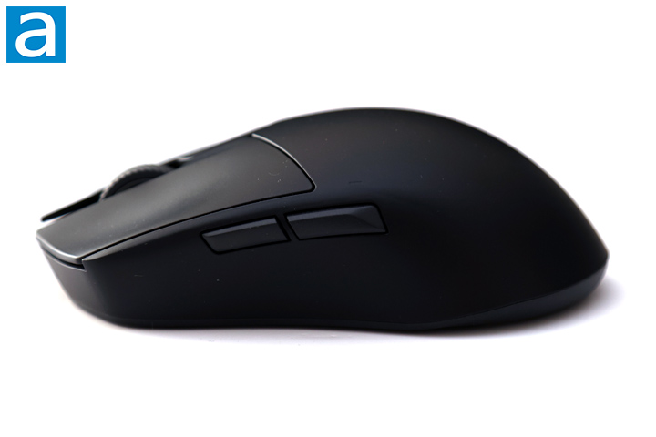 From this left perspective, you can see nearly all the buttons on the be quiet! Dark Perk Sym. The primary left and right buttons are separated from each other and the rest of the body. Each of them is sloped towards the middle to ensure the user's fingers rest in the middle of the buttons. Underneath, we have optical Omron D2FP-FN2 switches. According to the manufacturer, these switches can last seventy million clicks. The buttons are nice to press with decent weighting. Its sound is pronounced without being too clicky with a notably lower frequency pitched sound. The scroll wheel is notched, and internally there is a TTC Yellow encoder, which is known for its tactile feel. Down the top, there is a slim slit for a multi-color LED to show charge and power status. It only turns on when the mouse is first powered on or charging, but otherwise it stays off. It also indicates when you cycle through the DPI levels, as you will see later. Although the shape of the body is ambidextrous, the secondary button placement still leans towards right-handed users, as they are only on the left side. Here we have standard forward and back buttons. These feel nice to press with a good amount of travel and no spongy bottoming out. As for placement, they are located right above my thumb and are easy to access while remaining out of the way of accidental presses.