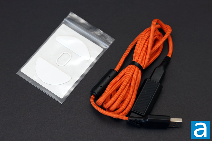As with many wireless mice, the be quiet! Dark Perk Sym can be used with or without cables. We have a bright orange braided USB Type-C to Type-A cable included. I do appreciate this splash of color on the cable to make it easy to identify from others when it is plugged into your system. The braiding is flexible enough with give throughout. Impressively, the USB Type-C connector is angled in a way that the plug and wire near the plug does not catch your surface and drag about. I have not seen this from other manufacturers and can appreciate the forethought here. An extra set of bottom skates is included if you need to replace the ones on the bottom of the Dark Perk Sym.