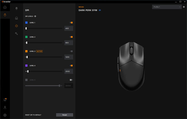 The second page is marked DPI, and users can change the five different sensitivity settings. You can also disable or enable levels to reduce the number of distinct levels. As mentioned previously, this range is between 100 to 32000 DPI. However, you cannot change the color for each DPI setting.
