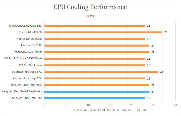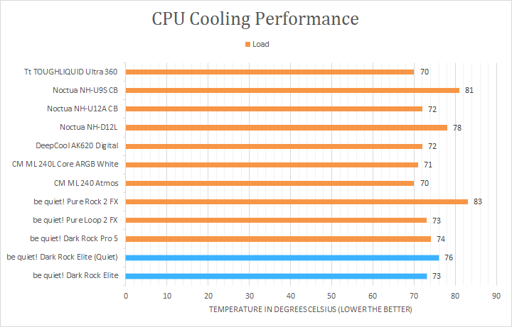 With more than enough time to load the processor, you can see how all the coolers performed with the peak temperatures recorded. From here, the be quiet! Dark Rock Elite performed very well, scoring a 73c in performance mode. This is not the coolest of results, as it was bested by all of the tested liquid coolers as well as a handful of air coolers like the DeepCool AK620 Digital and Noctua NH-U12A. Even so, this is only one degree warmer than the best air cooler. In quiet mode, this peak temperature rose to 76c, which is a small delta considering the quieter output. In both cases, we did not observe any thermal throttling under load.