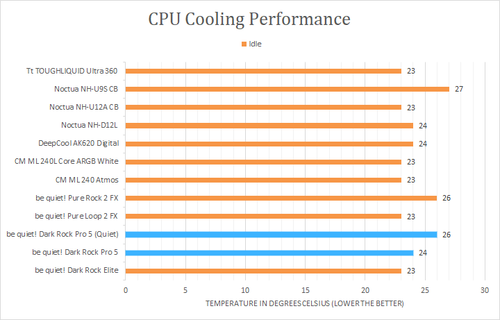 After letting my computer sit idle for a while, I checked the temperature of the hottest CPU core. From the first graph, you can see the be quiet! Dark Rock Pro 5 idled at a temperature of 24c. This was slightly warmer than some other coolers, although this is still only two degrees above ambient. In quiet mode, this temperature increased to a slightly warmer 26c, which is understandable given the slower fan speeds. In either case, these numbers are not too concerning. Even still, idle numbers do not give a full representation of what CPU coolers can do, so we started up the Prime95 tests to see the more pertinent results.