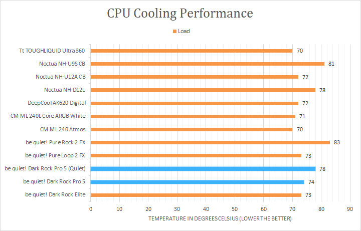 With more than enough time to load the processor, you can see how all the coolers performed with the peak temperatures recorded. From here, the be quiet! Dark Rock Pro 5 performed well, scoring a 74c in performance mode. This again is not the coolest of results, as it was bested by all of the tested liquid coolers as well as a handful of air coolers like the DeepCool AK620 Digital and Noctua NH-U12A. Similarly, it was slightly warmer than the Dark Rock Elite. Even so, this is only two degrees warmer than the best air cooler. In quiet mode, this peak temperature rose to 78c, putting it in line with the single-fan Noctua NH-D12L, while still performing better than its distant cousin, the Pure Rock 2 FX. In both cases, we did not observe any thermal throttling under load.