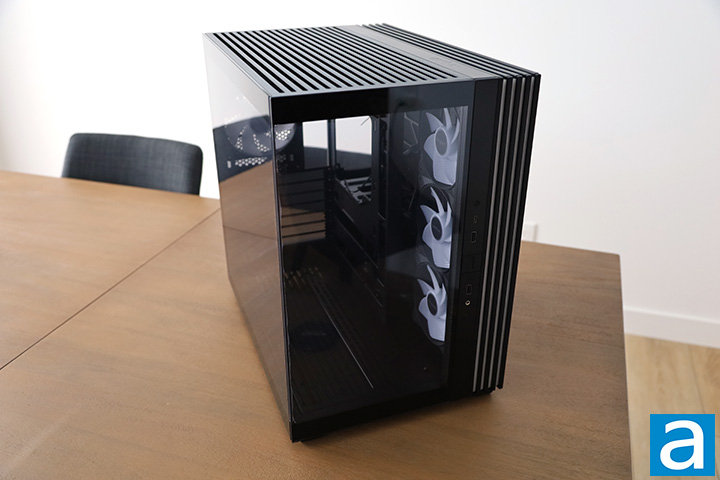 The front panel connectors are located on the actual front panel of the Light Base 600 LX, and for a good reason. The chassis can be placed in any orientation with a simple relocation of the four feet at the bottom. For example, placing it flat will result in the old-school horizontal desktop layout, while turning it upside-down will give you an inverted setup. Since the external light strip runs along three sides, the Light Base 600 LX exhibits appropriate symmetry for use in any context. For the rest of this review, I will assume the standard orientation.
