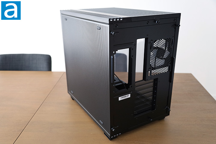 The back of be quiet!'s Light Base 600 LX is painted black to match the rest of the chassis. Compared to traditional cases with a bottom mounted power supply bay, the power supply is behind the motherboard, contributing to its width. Other than that, we can expectantly spot an included Light Wings LX 120mm PWM fan placed adjacent to the motherboard I/O backplate. Both side panels, along with the top and bottom panels, are held on using captive thumbscrews. There are fancier mechanisms out there for removing the side panels, but this is the simplest and most secure. The ventilated plates enclosing seven horizontal expansion card slots are painted black shown in our photo above. They can be converted and used with the included vertical GPU riser kit to show off your graphics hardware.
