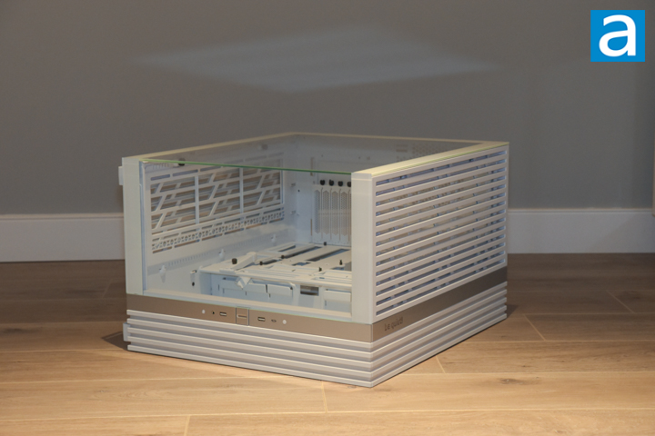 Four of the five removable panels can be removed by unscrewing the thumbscrews on the rear, sliding the panels back, and lifting away from the case frame. The thumbscrews are captive, allowing them to stay with the panel being removed and preventing you from losing them. As the front and side glass extends fully from top to bottom, I would not recommend removing the bottom panel unless the case is resting on its side. Otherwise, resting the case on the edges of tempered glass may result in breakage.