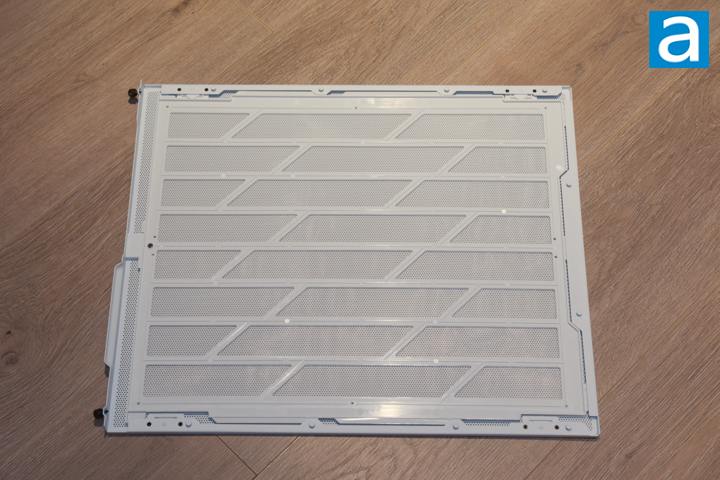 The left side panel is similarly secured by two captive thumbscrews, and has a removal tab on the back. The panel is made from metal with many small perforations to allow for airflow. On the inside, there is a secondary removal mesh filter that helps to block dust ingress. The mesh is mounted to a plastic frame to give it more structure. This frame is held with a magnet near the back of the panel, and it slides out for further cleaning.