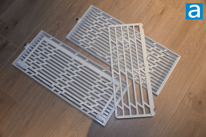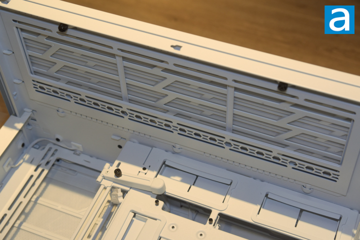 The top and bottom panels are identical. Each one can be removed via a single thumbscrew on the rear. The outer part of the panel is steel and resembles horizontal metal grates. Behind the metal is a plastic frame with protruding hooks that slot into the case frame. This plastic frame also holds a removable fine mesh filter that clips in. All likely intake fan areas for this case come with a mesh filter, which helps to reduce dust ingress.