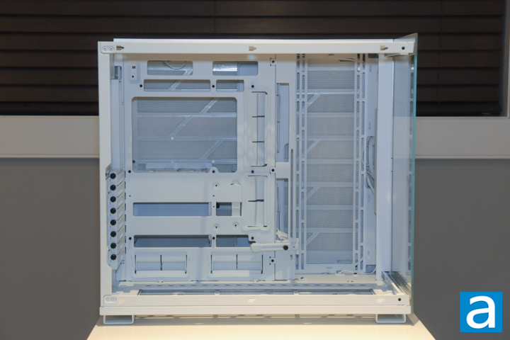 In the front chamber of the case, we find a roomy build area. The case is compatible with up to E-ATX motherboards, as well as backside connector designs. There is a cutout behind the motherboard for access to the processor area backplate. There are nine standoffs pre-installed for the ATX configuration. Furthermore, the case has engraved letters near standoff locations to indicate where they need to be installed for other motherboard sizes. The chart is intuitive and helps ensure proper mounting and placement. Along the side and bottom of the motherboard, there are sizable cable route cutouts with rubber grommets. The grommets hide the mess behind and protects the cables from rubbing directly against the metal frame. However, the top two cable routing holes above the motherboard do not have rubber grommets. There is also an adjustable graphics card support arm on the right of the area. You can pivot, extend, or raise this arm to the appropriate height for your video cards. As graphics cards have gotten heavier and larger over the years, this integrated support arm can prevent GPU sag and damage to the PCIe port on the motherboard.