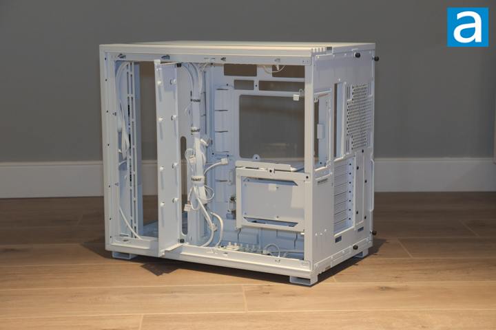 The right side panel is 6mm tempered glass, and holds to the case with two captive thumbscrews. There is a handy tab on the back to aid in its removal. This is attached onto a white surround on the back of the glass, which helps to hide fingerprints and mounting hardware. Six plastic circles protrude from the glass and hook onto slots on the case. The front glass panel is the same thickness, and can be removed by unscrewing a screw on the top and bottom before sliding it out.