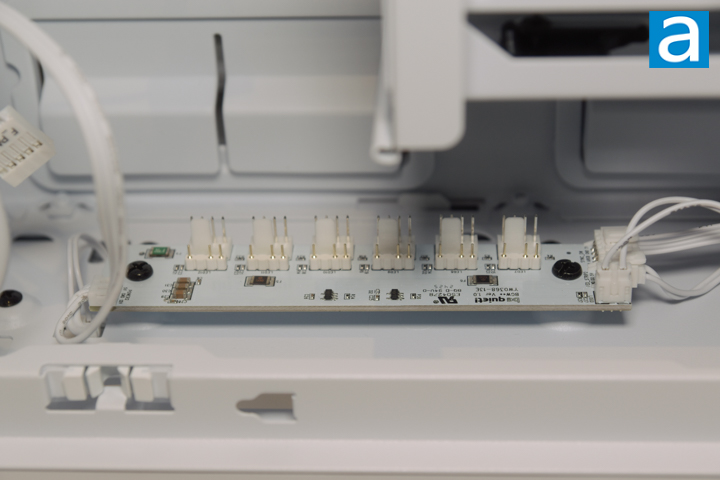 There are two fan and RGB LED hubs included in the Light Base 900 DX. They are located near the top and bottom of the rear chamber. Both fan hubs support up to six PWM fans and addressable RGB headers each for a total of twelve. The external LEDs can operate independently without software. However, the ARGB header can be plugged into the motherboard for full RGB LED control. The fan hubs require SATA power and have a PWM fan cable to control fan speed.