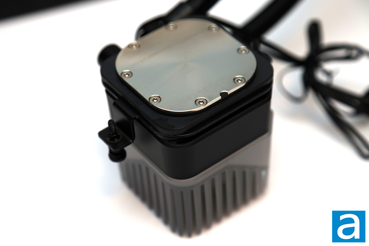 Going down the tubing, on the other end is the contact plate, pump, and water block of the be quiet! Light Loop 360mm. This unit measures 75mm in height, 94mm in width, and 82mm in depth. As this includes the pump inside, as well as a patterned top, it is no surprise it is slightly taller. Even so, this should not be an issue in most computer cases. The base contacting the processor is copper with nickel plating to increase its durability and resistance to corrosion. The base is flat with a slight circular finish that shows polishing marks. However, I also noticed two lines of stains that I could not remove, which is a bit unfortunate. Two holes with captive screws can be found on opposite edges for mounting purposes. A plastic label is placed on this area out of the box, so it is important you remove the label before installing it. Inside, we have a pump operating at an adjustable range of 1500 to 2900 RPM. It is powered and controlled through a 4-pin PWM header.