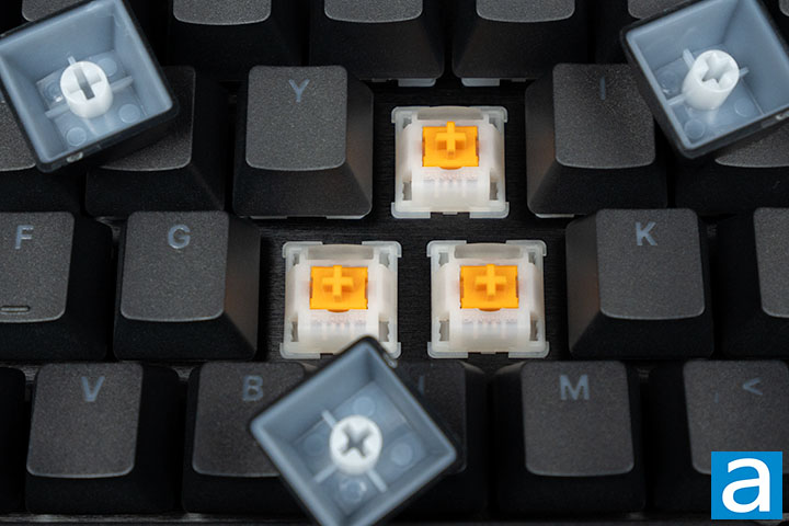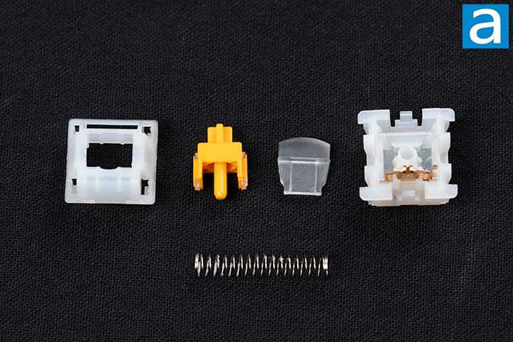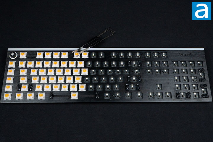 After removing the keycaps, the switches, stabilizers, and the knob must be removed. Our version of the be quiet! Light Mount Silent Linear utilizes the be quiet! Silent Linear Orange switches, which are Cherry MX and 5-pin hot-swappable PCB mounted. The stem is made of POM, or polyoxymethylene, while the housing is made of PA66, also known as Nylon 66. All stems are factory lubricated to allow for smooth movement as the keys are pressed. Each switch also contains a translucent plastic tab to diffuse the ARGB lights coming from the PCB. The springs inside the switches measure to be 21mm. More specific information, such as actuation force and travel distance, is not listed on the manufacturer's website. In addition to the be quiet! Silent Linear Orange switches, there is also the option for the be quiet! Silent Tactile Black switches.