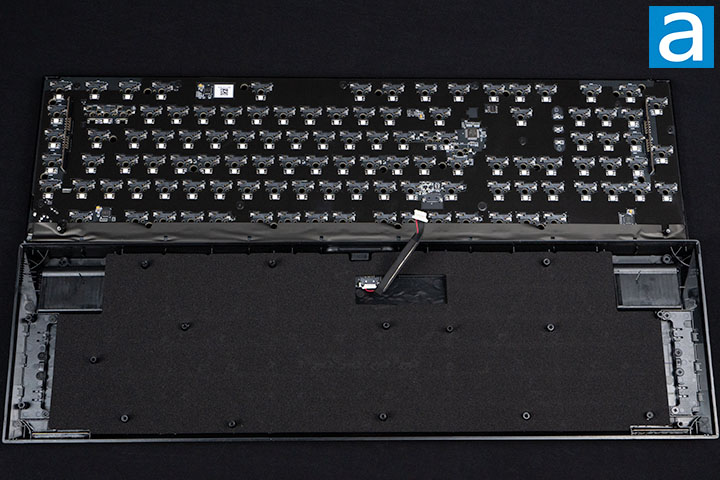 Upon opening the keyboard, the top frame, top plate, and PCB will separate from the bottom case. The PCB is top-mounted with north-facing LEDs. The PCB material was not specified. The keyboard also has three layers of foam, with the first one being between the top case and PCB, while the second one is below the PCB. The last piece of foam fills the bottom case. All these materials fulfill the purpose of reducing the noise of keystrokes with the intention of making the keyboard silent. As mentioned from my testing earlier, I would say the bottoming-out sound of the keys is quiet and muted. However, the stem rattling sound is noticeable enough that I would not consider the keyboard to be silent.