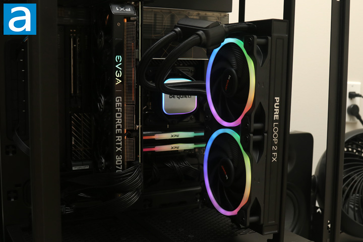 As for the sound analysis section, on a scale of 0 to 10 where 0 is silence and 10 is very loud, I would rate the be quiet! Pure Loop 2 FX at around 4.0/10 under full load. The two Light Wings fans and water pump was reasonably quiet despite running full bore in our tests. On a day-to-day use, the cooling solution is notably quieter than the original Pure Loop, which is another bonus, and is similar in noise output compared to some air coolers. I also appreciate the addressable RGB lighting on the fan, which provides some nice colors to my system.