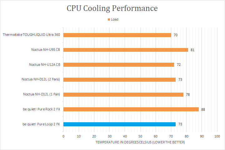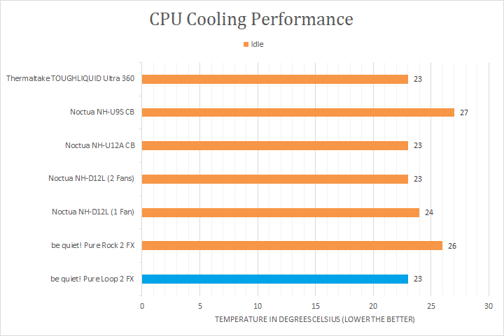 After letting my computer sit idle for a while, I shook my mouse to wake the computer to check the temperature. From the first graph, you can see the be quiet! Pure Loop 2 FX 240mm idled at the lowest temperature of 23c. This is among the coolest idle temperature readings across all of the tested coolers, matching the larger Thermaltake TOUGHLIQUID Ultra 360 and the Noctua NH-U12A chromax.black, which is great to see. This being said, idle results do not give a full representation of what CPU coolers can do, so we started up the Prime95 tests to see the more pertinent results.