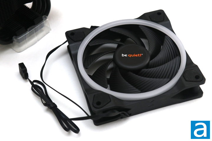 For the fan in question, we have the be quiet! Light Wings fan. This is a variation of the 120mm PWM high speed retail version, as it is limited to 2000 RPM, as opposed to the 2400 RPM on the retail version. Internally, this uses rifle bearings. Unfortunately, we do not have any other specifications for its maximum airflow rating or air pressure. The rated fan noise maxes out at 24.4 dbA. The rated lifespan of this fan is 60,000 hours, which translates to around 6.8 years if operated every day, every hour. Otherwise, the fan has a black frame and impeller, with a translucent frame around the fan for the addressable RGB LEDs to shine through. The corners have rubber pads around to reduce vibrations between the fan and the heatsink it is mounted to.