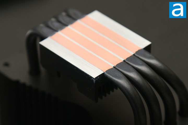 From above, you can see how the heatpipes lead out the bottom of the be quiet! Pure Rock 2 FX and into the fin array. This is made more apparent as you can see the copper color exposed and contrasted from the rest of the aluminum base. This allows for the heat pipes to directly make contact with the CPU, and is often what we see from other budget-focused CPU coolers, like the aforementioned SilverStone AR12-TUF. The base however does seem pretty flat with no notable gaps between the aluminum base and copper pipes. There also does not seem to be any milling marks or abnormalities here. Out of the box, the thermal paste already comes pre-applied and protected by a plastic cover, but I wish the plastic cover made a seal around the base and prevent other debris from getting into this area.