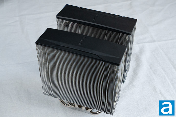 Considering the dimensions of the Pure Rock Pro 3, it falls into the common category of 120mm coolers, which should fit in most mid-tower ATX cases. It measures 139mm in length, 124mm in width, and 155mm in height including the fans. I counted a total of 100 aluminum fins after a few attempts. They are mostly separated 2mm from each other with some slight deviations. I calculated the total surface area of the fins to be about 0.98m2 with some rough measurements, ignoring the thickness. Looking between the fins, the six heat pipes connected to the contact plate pass through each heatsink tower. The total weight of the Pure Rock Pro 3 is 1070g, which is lighter than I expected, considering it is a dual tower cooler.