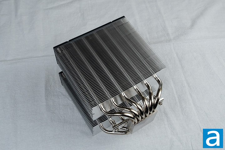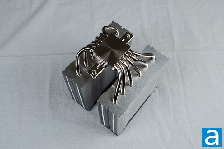 The Pure Rock Pro 3 comes with thermal paste already applied with a plastic cup covering it even though my picture does not show it. Examining the bare contact plate of the Pure Rock Pro 3 reveals a solid metal base with the heat pipes passing through it. Both the heat pipes and contact plate are made of copper with nickel plating for corrosion protection. Using a solid metal base will have an impact on the thermal performance of the cooler, since solid copper has a thermal conductivity of 401W/mK, while the thermal conductivity of heat pipes can range from the thousands to hundreds of thousands. The nickel plating will further reduce the performance since it has an even lower thermal conductivity of 91W/mK, but the effects should be limited as it is only a thin layer. The benefit of a solid metal base, however, is a more even distribution of heat to the multiple pipes compared to a direct contact design.
